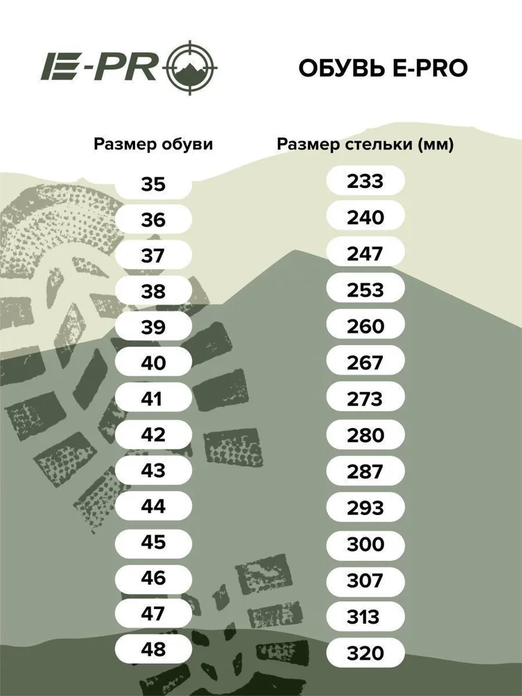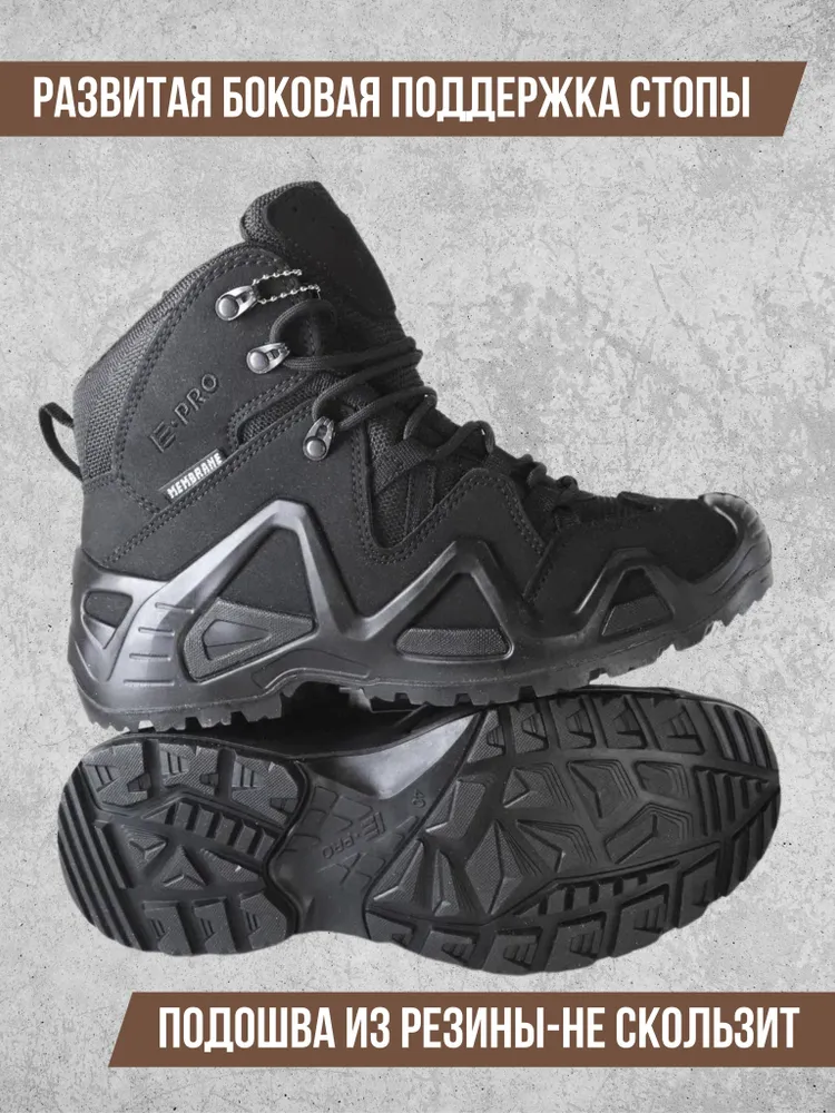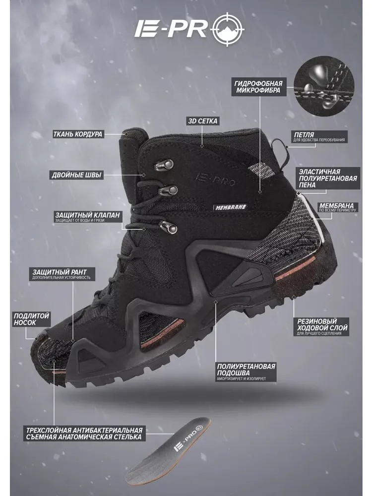 Зимние ботинки E-PRO - это многофункциональная обувь для работы, активного отдыха, треккинга и туризма. Трекинговая обувь E-PRO – это современная линия профессиональной тактической обуви. Изготовлена из высококачественной микрофибры толщиной 2 мм и прочного материала Cordura. Данная модель имеет мембрану, которая обеспечивает водонепроницаемость и отводит излишки влаги с поверхности кожи, а благодаря применению инновационного утеплителя Тинсулейт (Thinsulate) вам будет комфортно даже зимой. Защитный рант обеспечивает необходимую стабилизацию ноги, распределение жесткости по всей конструкции ботинка, а также адаптацию обуви в соответствии с анатомией стопы. Спереди подошва заходит на носок, обеспечивая его защиту от повреждений. Внешняя часть подошвы с протектором сделана из натуральной резины, что значительно улучшает сцепление на скользкой поверхности. Благодаря шнуровке их удобно надевать, а высота берца хорошо удерживает голеностоп, защищая его от травм. За эффективную амортизацию отвечает трехслойная анатомическая стелька. Непромокаемые теплые ботинки обеспечивают комфорт в движении, обладают хорошей паропроницаемостью за счет мембраны, защищены от влаги, обеспечивают сухость вашим ногам, защищают стопу от ударов и вывихов. Трехслойная анатомическая стелька отвечает за эффективную амортизацию и улучшает отвод влаги внутри ботинка, а также создает дополнительный комфорт при движении.