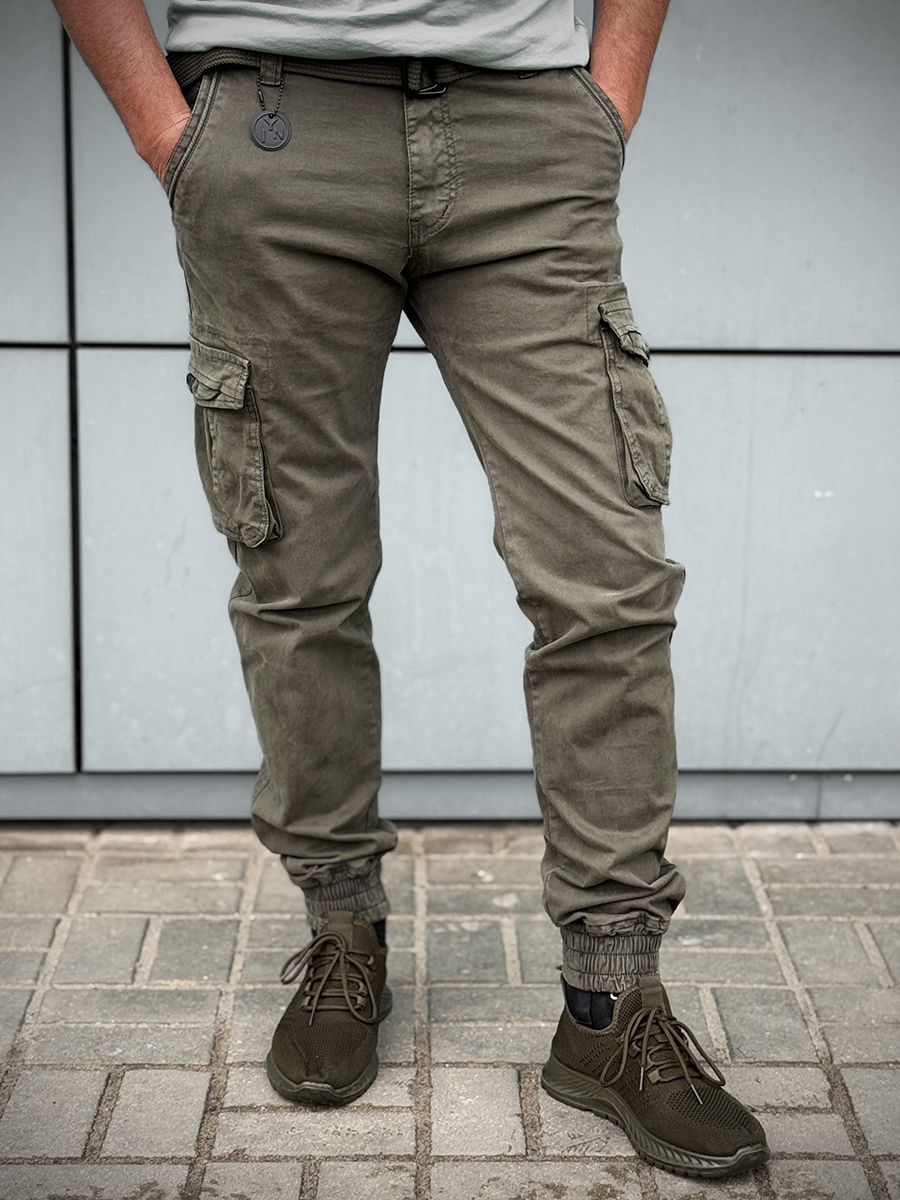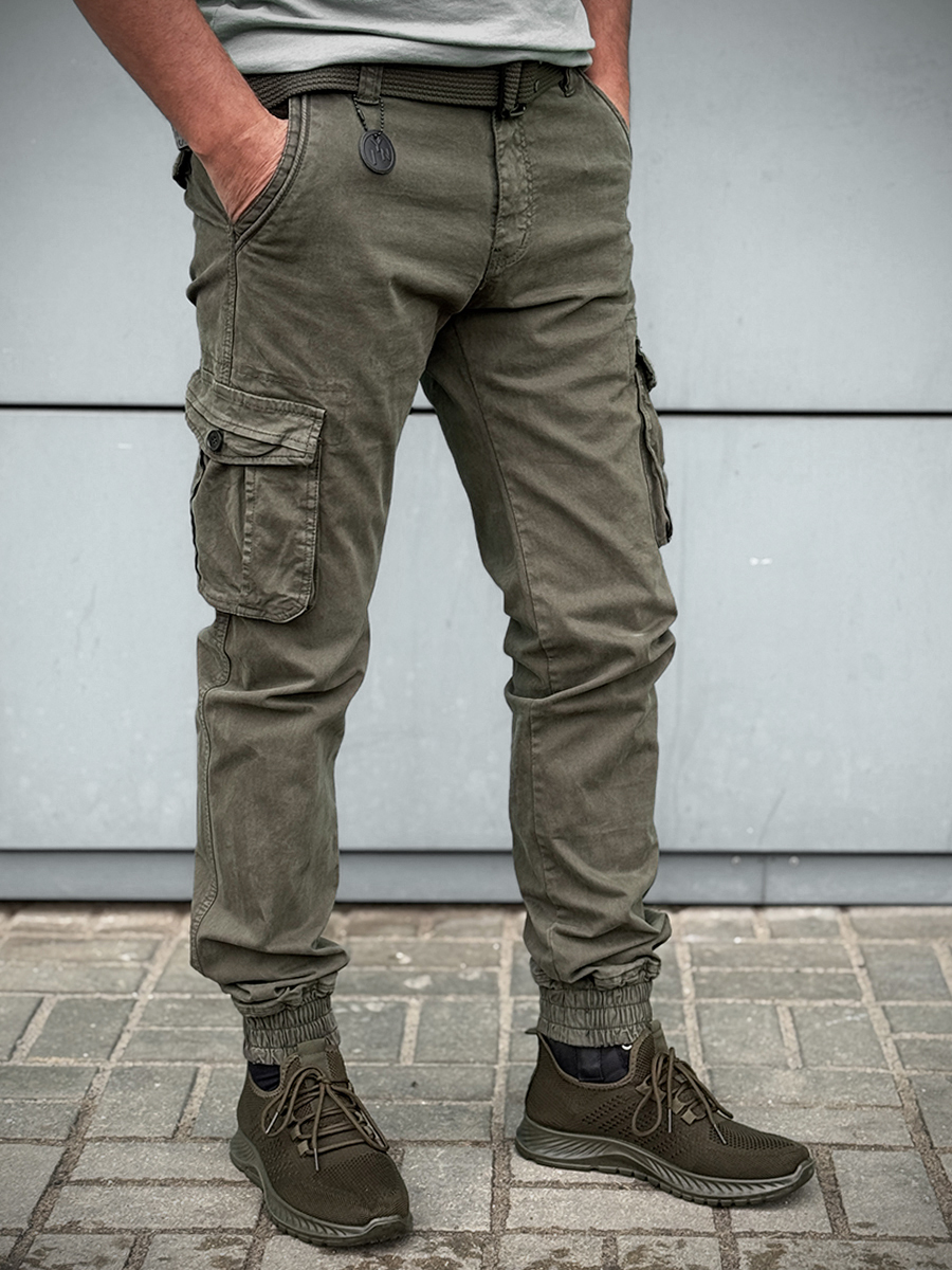 Джоггер из облегченной хлопковой ткани. Модель с задними карманами на пуговицах, боковые карманы на кнопках. Низ штанин на резинке. В комплекте ремень.
