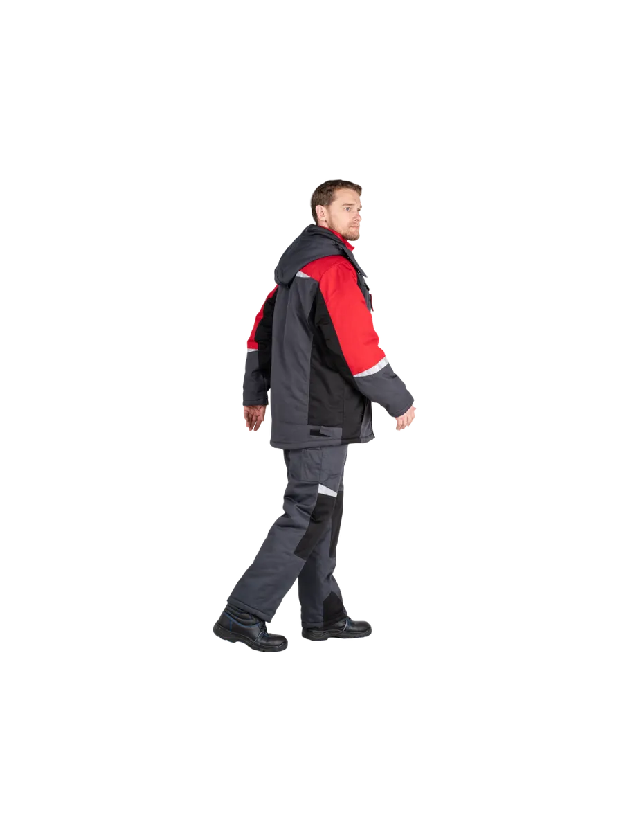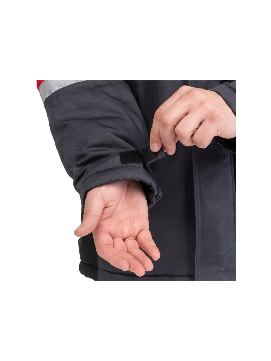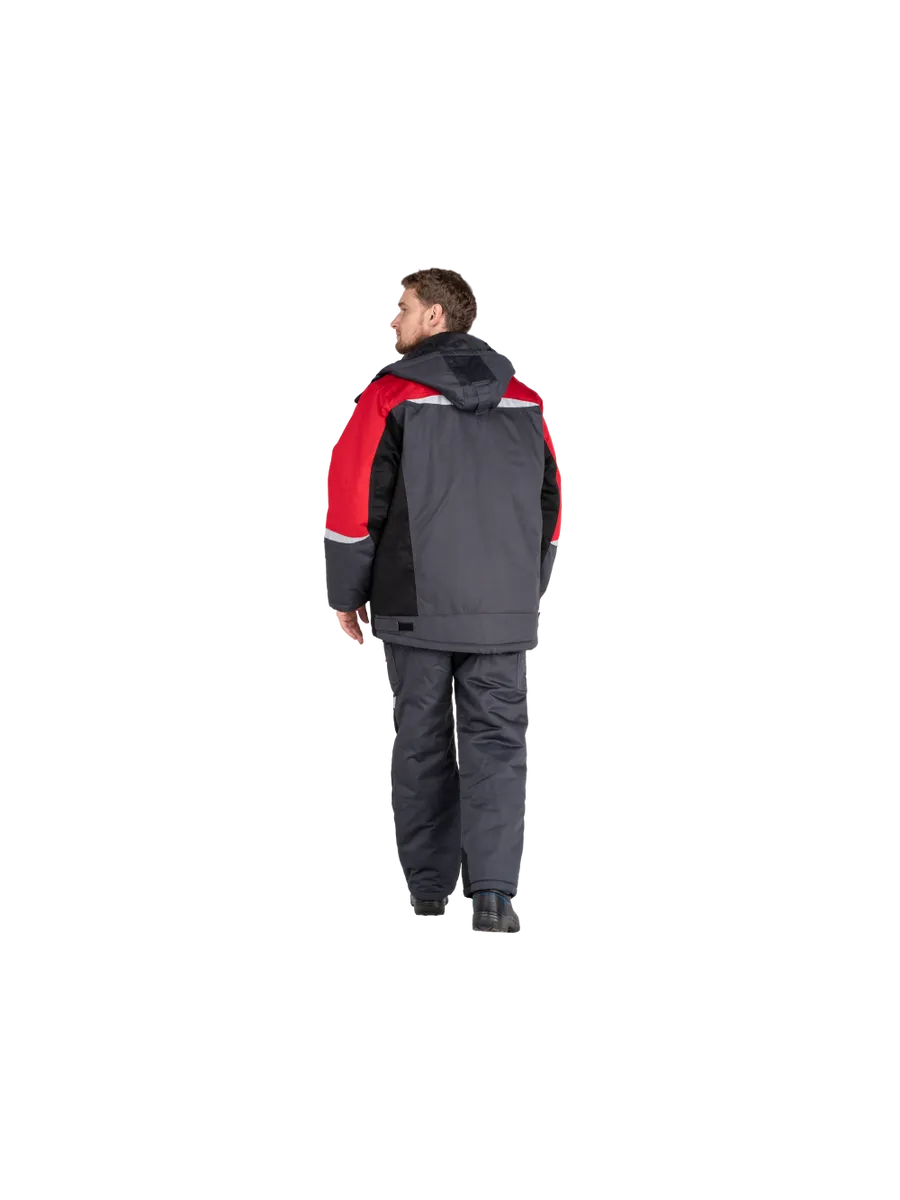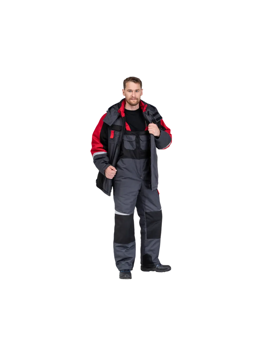 Костюм рабочий "Фаворит-Мега" представляет собой функциональную зимнюю спецодежду для мужчин, выполненную в сочетании темно-серого, черного и красного цветов. Изделие состоит из куртки и полукомбинезона, обеспечивающих максимальный комфорт и защиту в холодное время года. Куртка удлиненная с закрытой застежкой на молнию и ветрозащитным клапаном на липучку. Ткань изготовлена из полиэфирнохлопковой смеси: 65% полиэфир (п/э) и 35% х/б. Материал характеризуется водоотталкивающими (ВО) свойствами и плотностью 215 г/кв.м. В конструкции предусмотрена ветрозащитная прокладка для дополнительного тепла. Глубокий воротник-стойка усиливает защиту от ветра, а регулируемый капюшон пристегивается к воротнику на молнию. Рукава комбинированные, с притачной утепленной подкладкой и хлястиками для регулировки прилегания. Обе стороны спинки удлиненные для улучшенной защиты. Карманы куртки многофункциональные: нагрудные накладные с фигурными клапанами и липучкой, нижние закрыты застежкой-листочкой. На левой подкладке предусмотрен внутренний карман. Полукомбинезон выполнен с акцентом на удобство и практичность. Ткань аналогичная куртке: полиэфирнохлопковая, плотностью 215 г/кв.м, с водоотталкивающей отделкой. Спинка оснащена эластичной резинкой для улучшенного прилегания и комфорта. Длина бретелей регулируется застежкой-фастексом. Передние части имеют накладные карманы для инструментов и мелочей, а задние половинки усилены накладками и снабжены интегрированным функциональным карманом. Боковые части оборудованы липучками для дополнительной регулировки. В зоне шагового шва усилительные элементы, обеспечивающие долговечность изделия. Благодаря включению светоотражающих СОП элементов, костюм гарантирует безопасность в условиях плохой видимости. Каждая деталь тщательно продумана для максимальной защиты и комфорта в условиях низких температур.