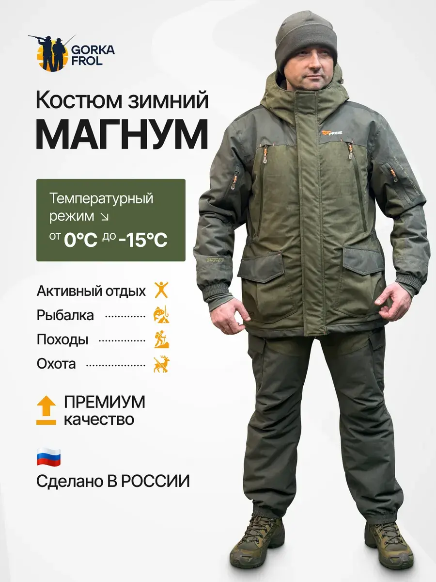 Зимний костюм PRIDE Магнум -15°C создан на базе легендарной модели «Горка» и отлично подойдёт для активной охоты, рыбалки и туризма в холодное время года. В нём сочетаются анатомический крой, прочные материалы и надёжная защита от ветра и влаги.