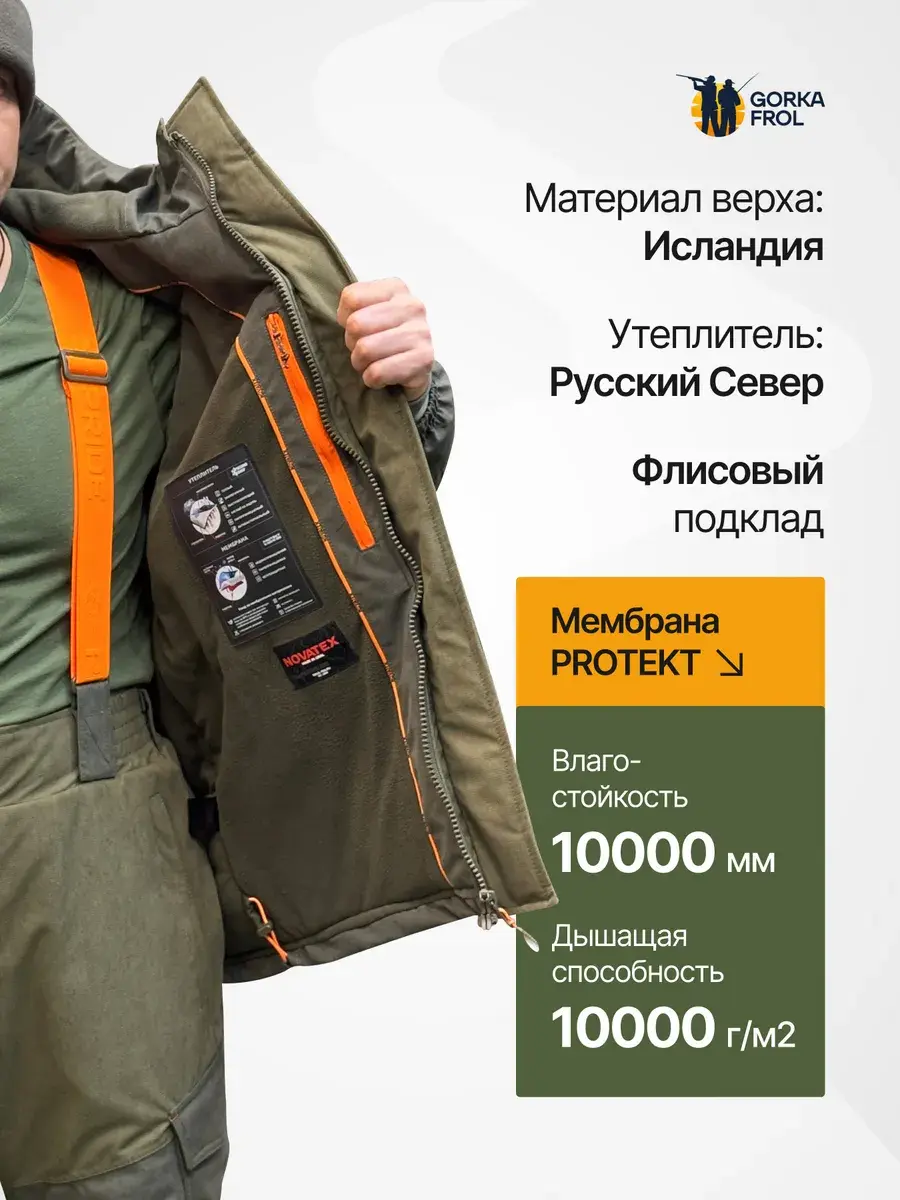 Костюм состоит из утеплённой куртки и брюк. Верх выполнен из плотной ветро- и влагозащитной ткани Исландия (200 г/м²). Утеплитель «Русский Север» сохраняет тепло до -15°C, флисовая подкладка обеспечивает дополнительный комфорт. Куртка снабжена вместительными карманами, капюшон регулируется по объёму. Брюки фиксируются ремнём и утягиваются по низу.