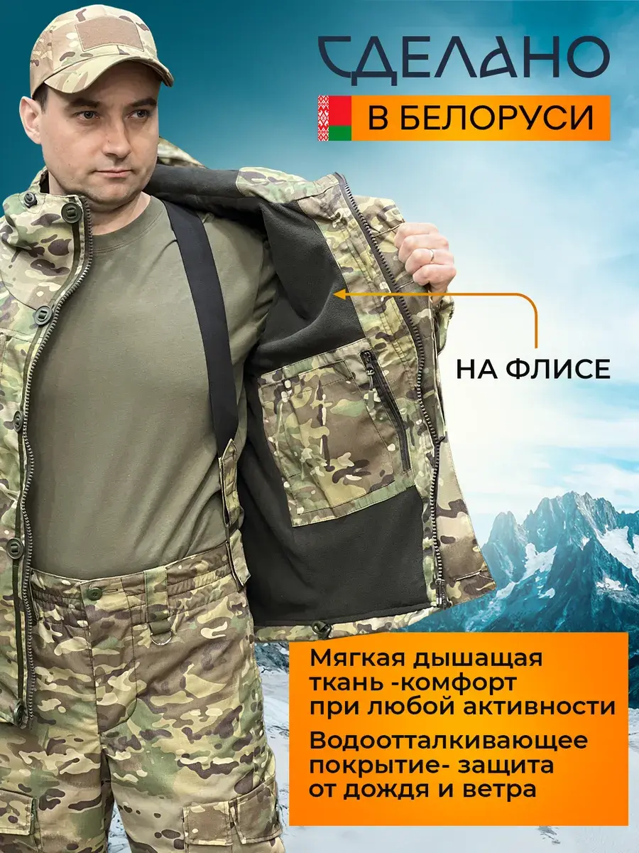 Изготовлен из прочной ткани рип-стоп с флисовой подкладкой. Надёжно защищает от ветра, сохраняет тепло и позволяет телу "дышать". Лёгкий и комфортный в движении, не стесняет активности, быстро сохнет.
