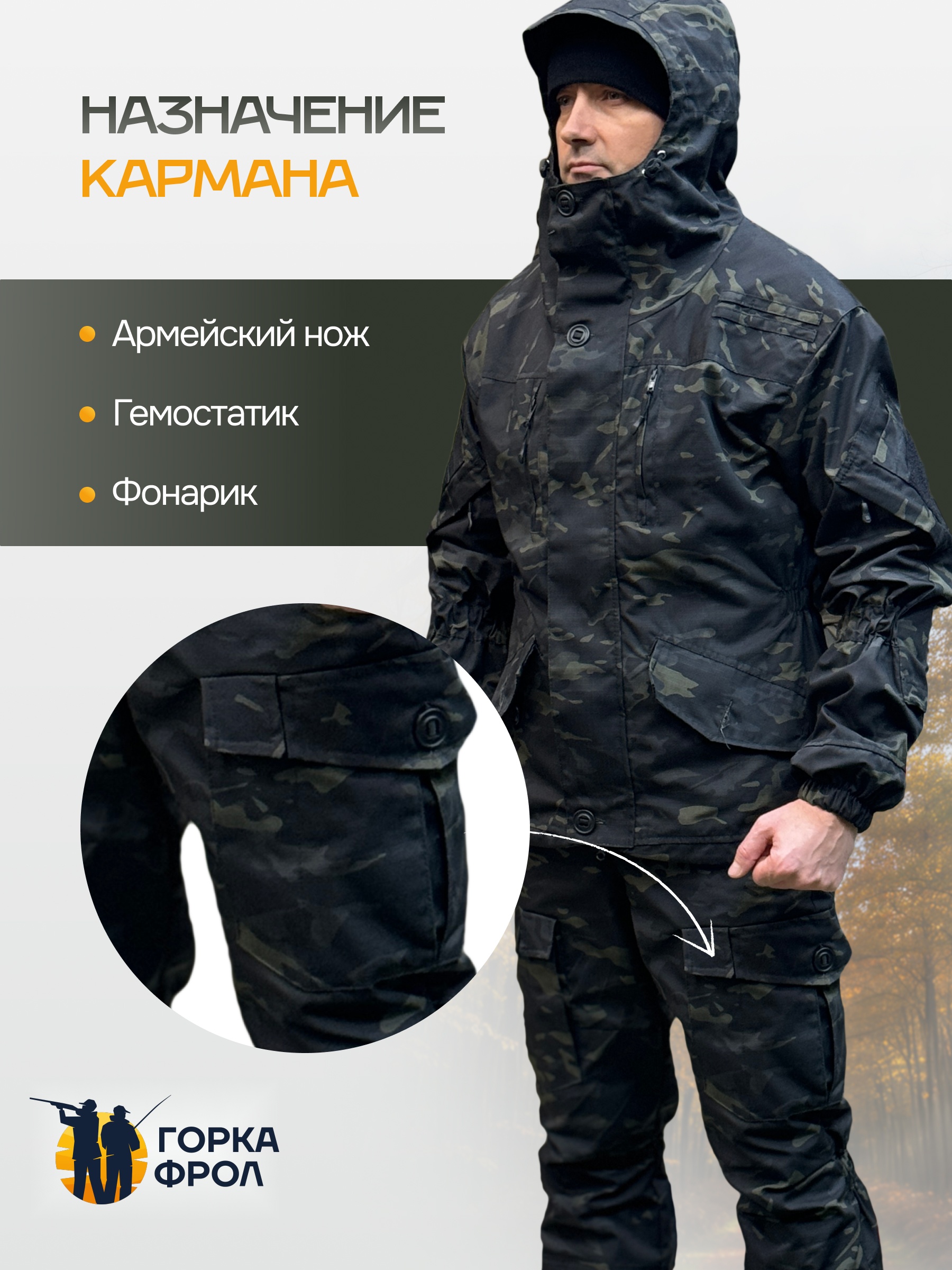 Костюм Горка 6М «Чёрный мультикам» — тактический демисезонный комплект для охоты, рыбалки, страйкбола и туризма. Эффективно маскирует в лесистой и пересечённой местности, не сковывает движений и выдерживает экстремальные нагрузки.