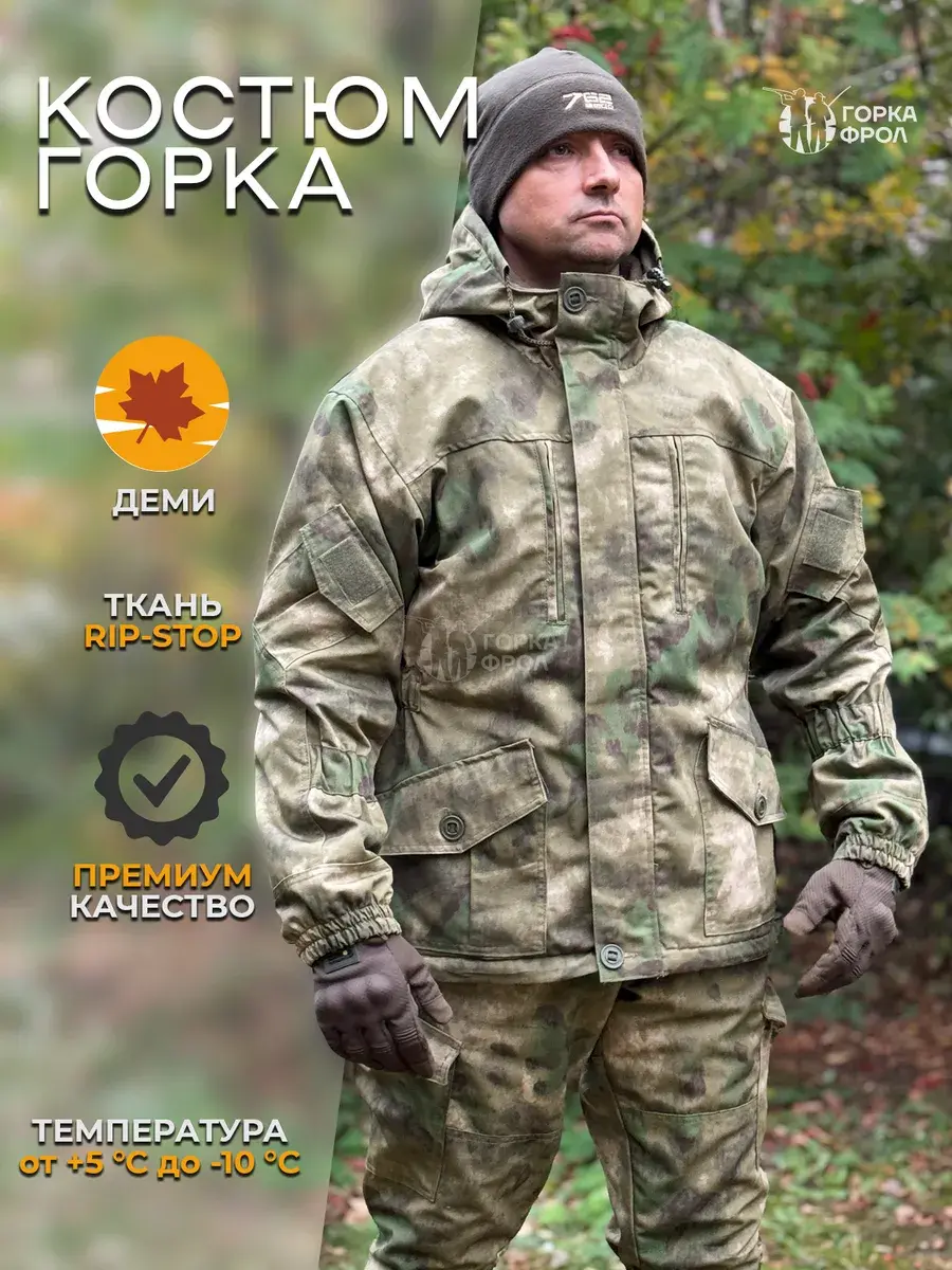Демисезонный камуфляжный костюм Горка с утеплённой флисовой подкладкой для куртки, брюк и капюшона. Прямой крой обеспечивает свободу движений и комфорт в любых условиях. Центральная застёжка — молния-трактор с ветрозащитной планкой, открывающаяся сверху и снизу, надежно защищает от ветра и влаги. Костюм оснащён 7 карманами на куртке и 6 на брюках для удобного хранения вещей. Усилительные накладки в местах повышенного износа гарантируют долговечность. Пыльник на брюках защитит от грязи, пыли и клещей. Идеален для охоты, рыбалки, туризма и активного отдыха в демисезонный период.