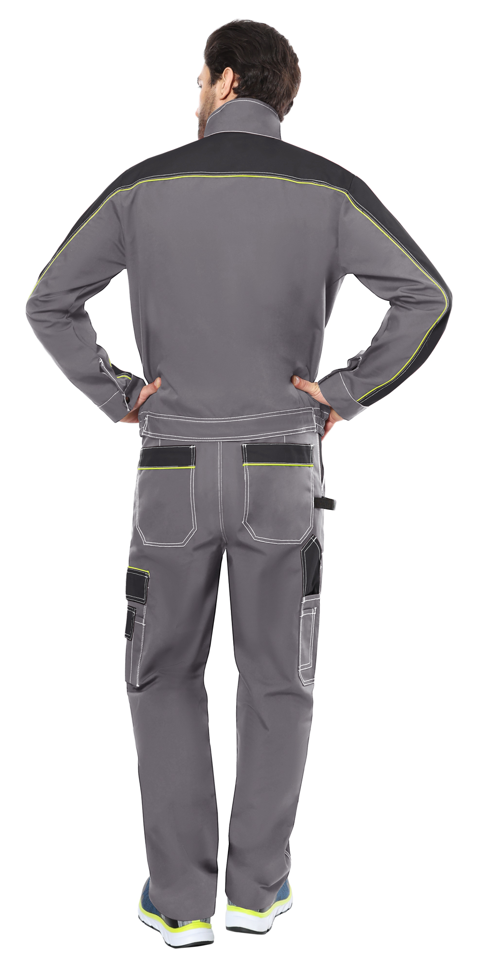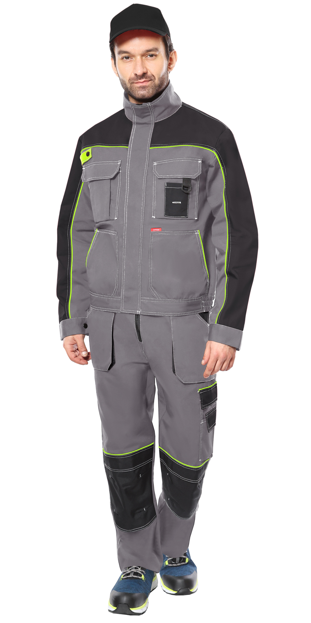 Полукомбинезон прямой с застёжкой спереди на молнию, с отрезной грудкой и отрезной спинкой, с бретелями. Полукомбинезон с накладными карманами спереди, сзади и на боковых швах, с объёмными наколенниками из плотной, непромокаемой ткани с верхним входом для амортизационного вкладыша. Бретели регулируются при помощи застежек-фастексов и резинки.