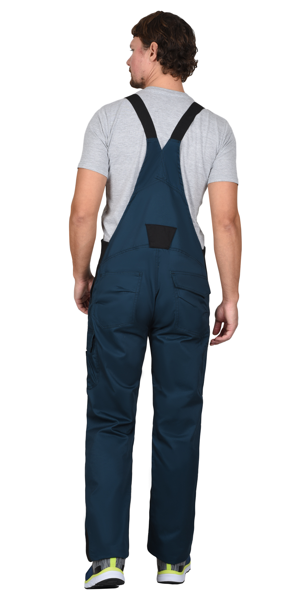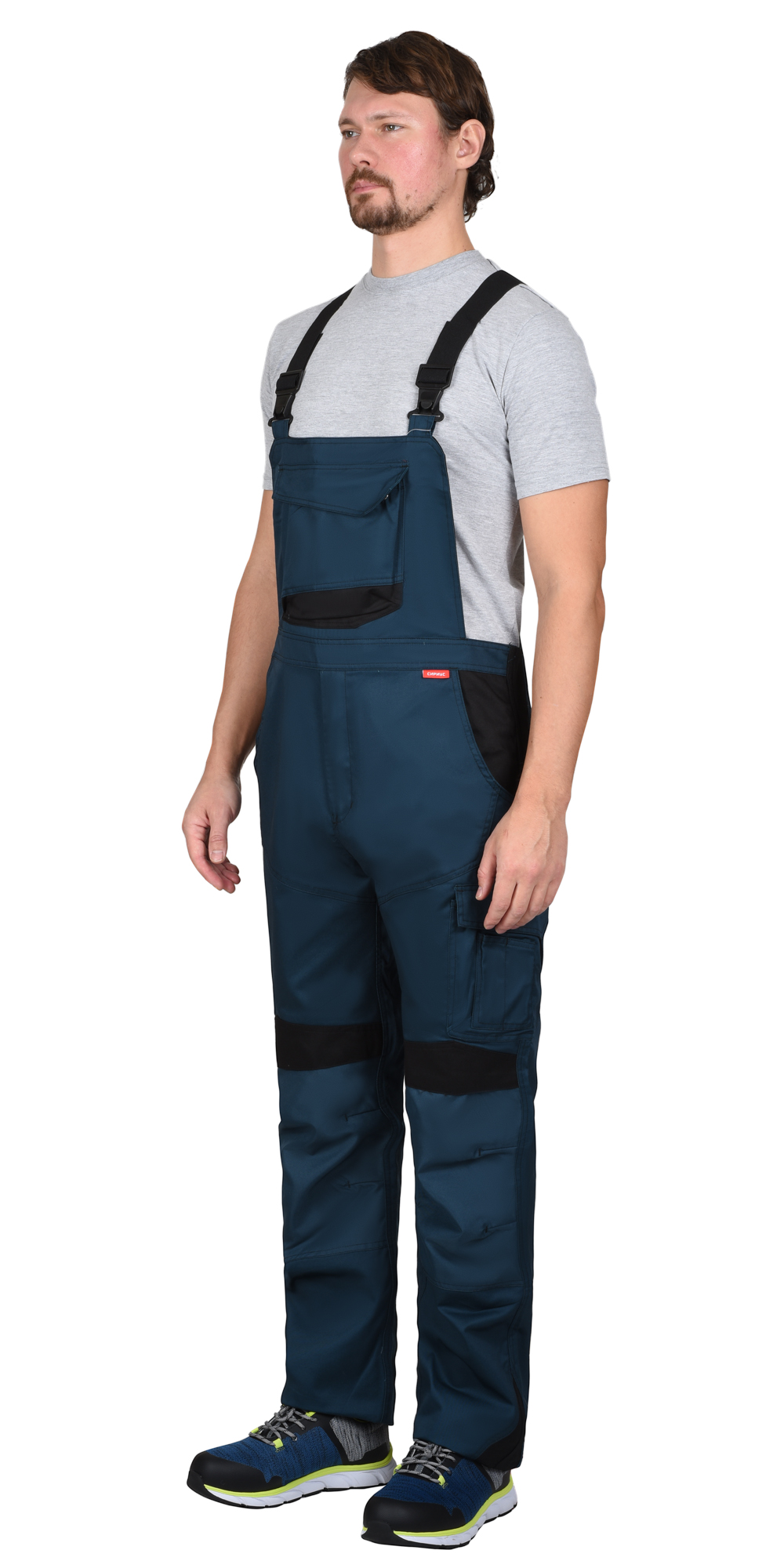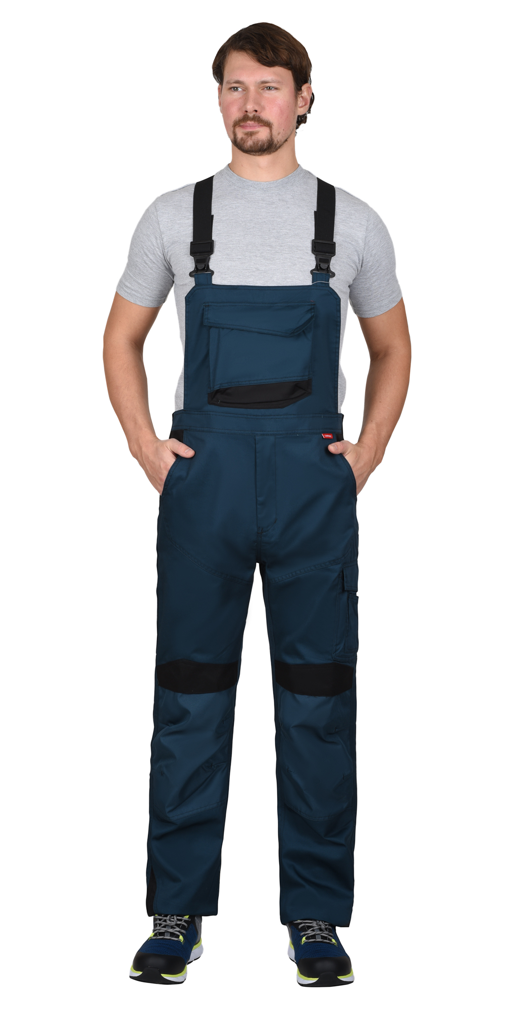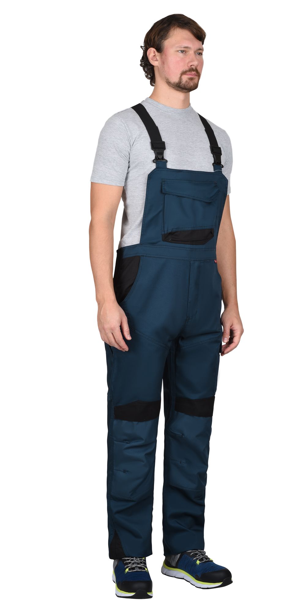 Полукомбинезон прямой с застёжкой спереди - гульфик с молнией, с отрезной грудкой, отрезной спинкой, с бретелями. В боковом шве полукомбинезона со стороны задней половинки вставка из эластичного материала для удобства использования. Полукомбинезон с карманами спереди, сзади и на боковых швах, с объёмными наколенниками из полиэфирной, плотной, непромокаемой ткани с верхним входом для амортизационного вкладыша. Бретели регулируются по длине.