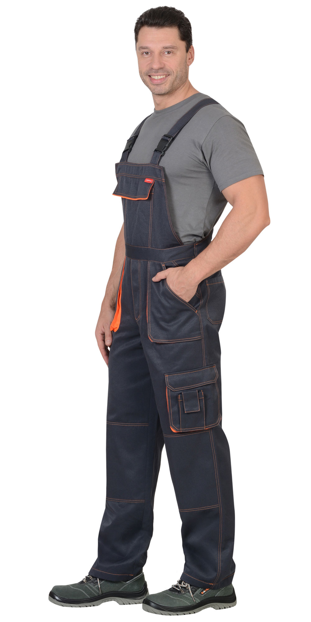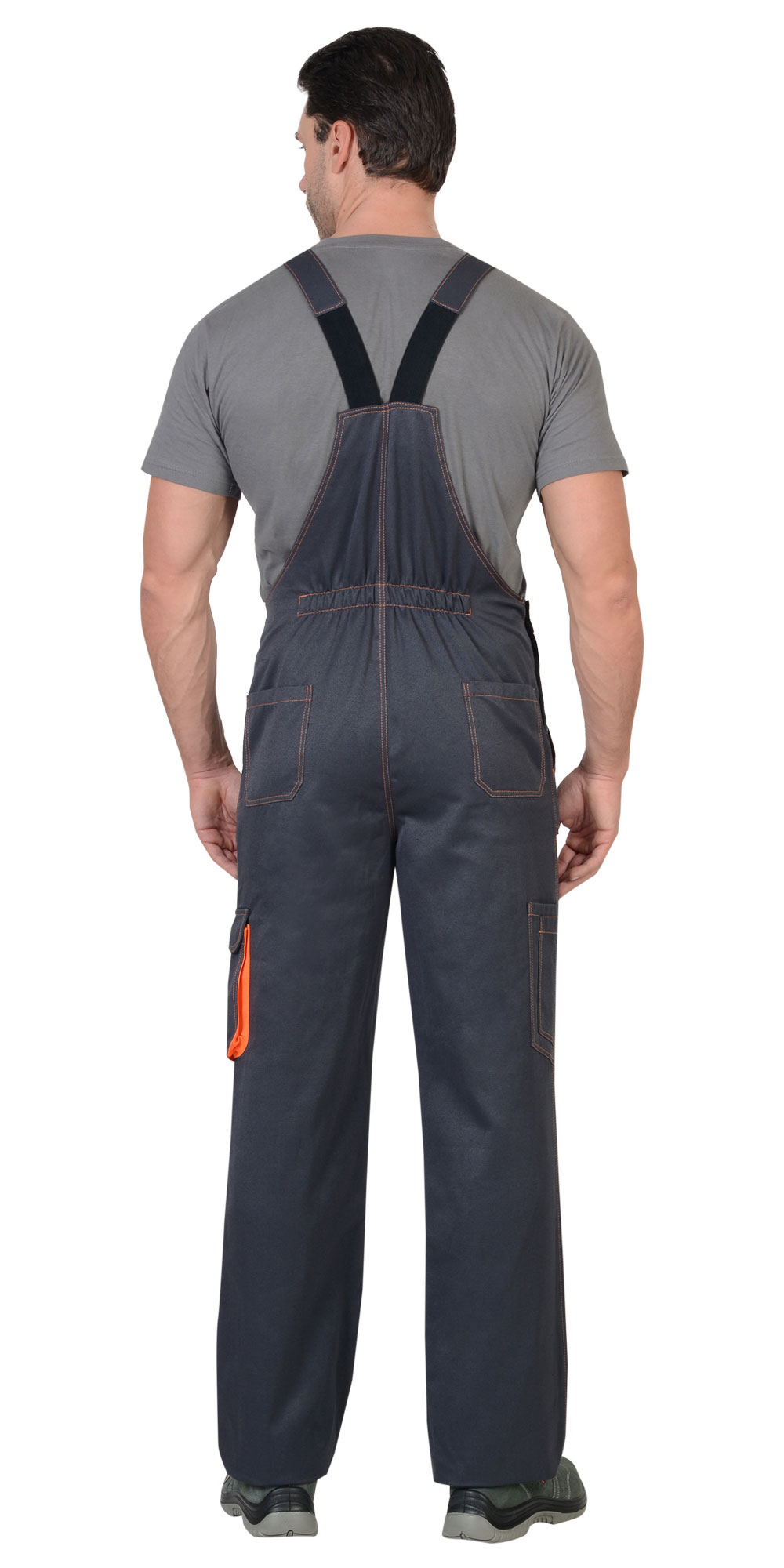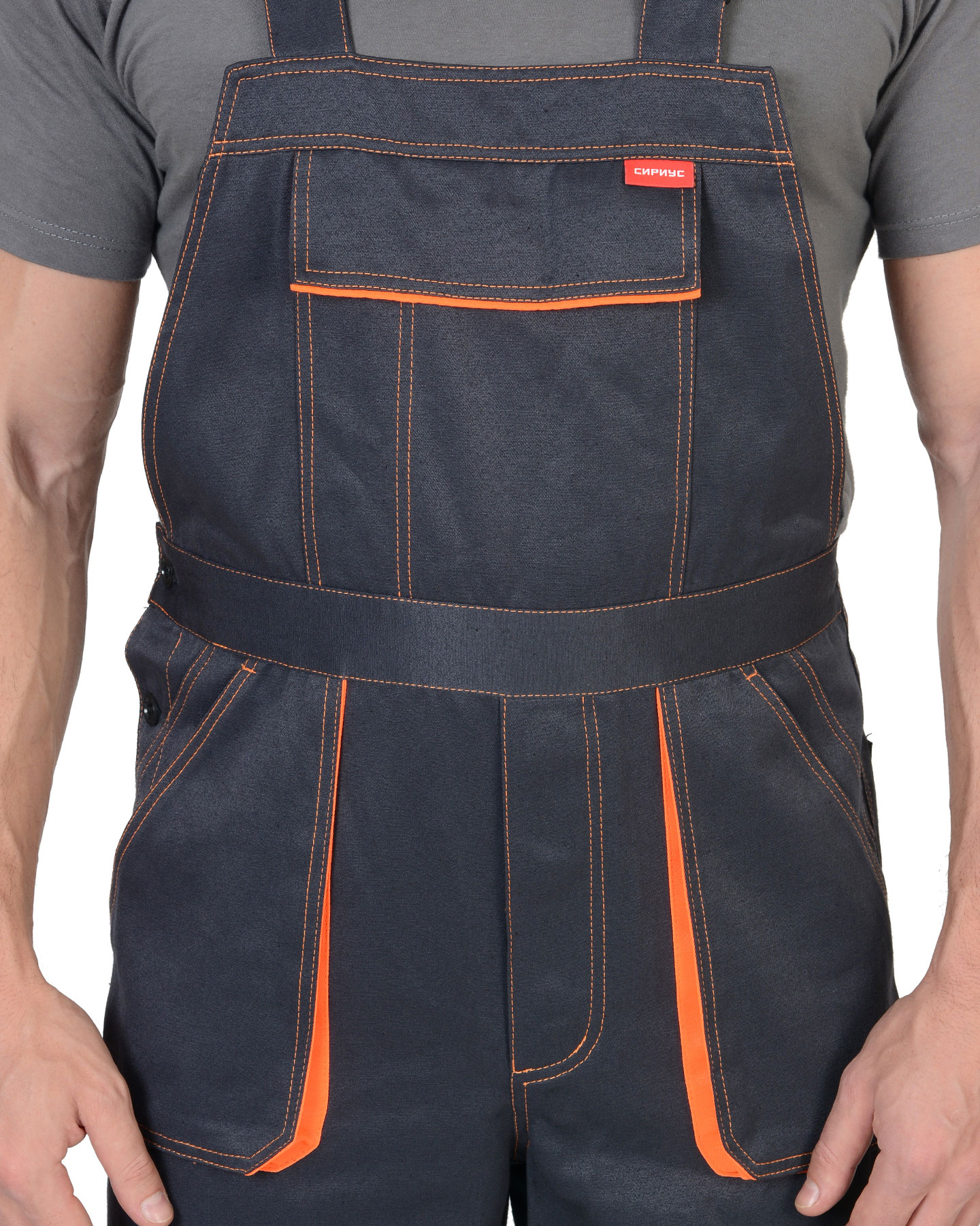Полукомбинезон - прямой с контрастной отделкой, с бретелями, с застёжкой спереди и с застёжкой в правом боковом шве на три петли и три пуговицы. Полукомбинезон с различными многофункциональными карманами, спинка с частичной стяжкой по талии для лучшего прилегания по фигуре.