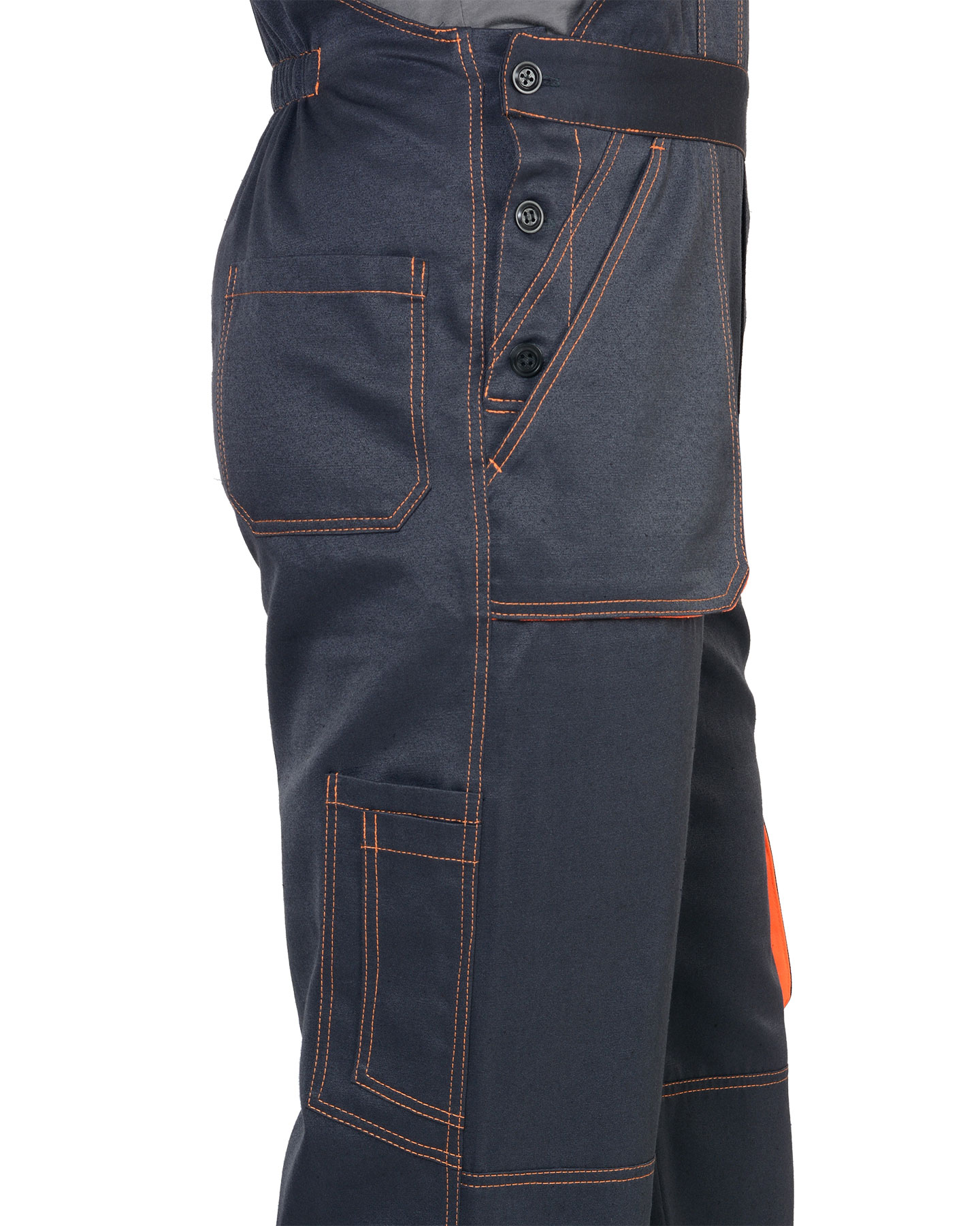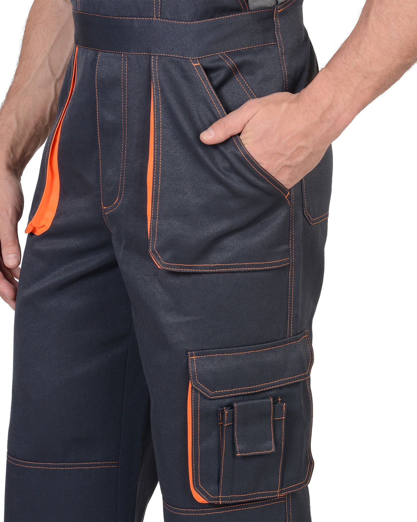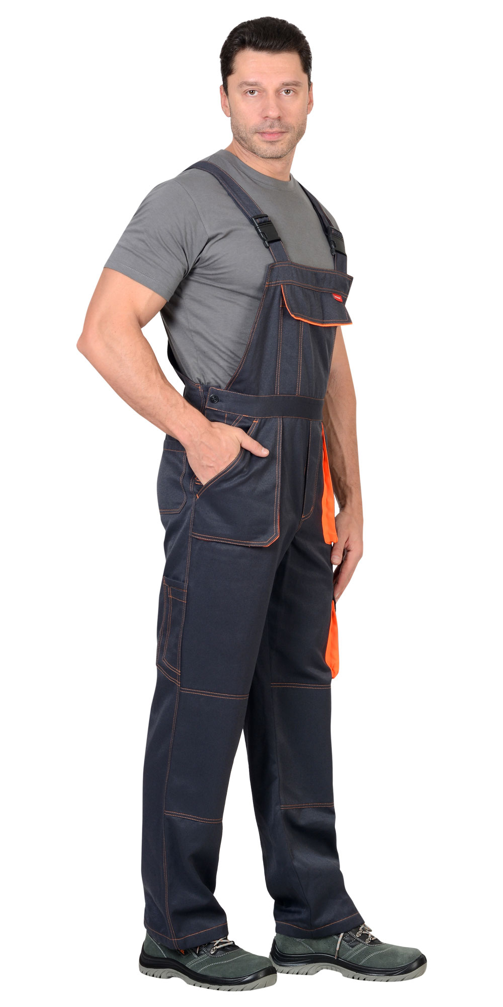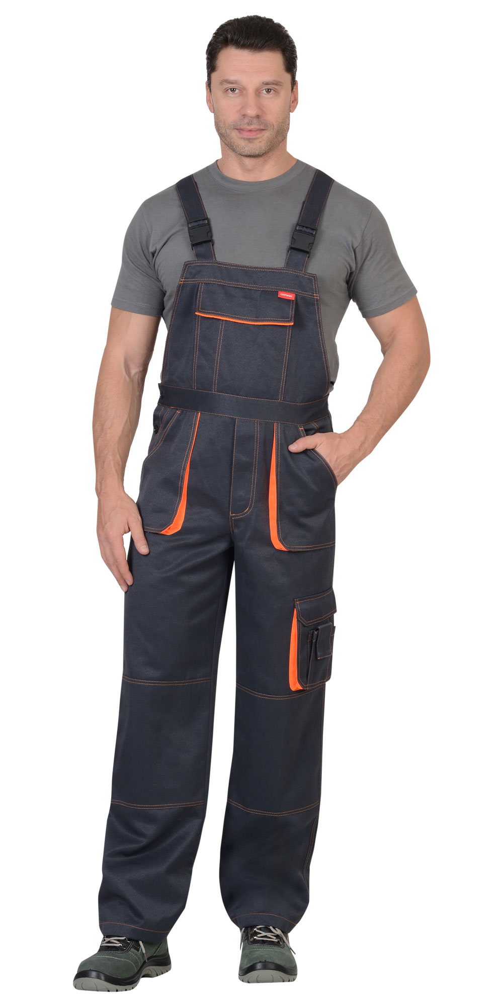 Полукомбинезон - прямой с контрастной отделкой, с бретелями, с застёжкой спереди и с застёжкой в правом боковом шве на три петли и три пуговицы. Полукомбинезон с различными многофункциональными карманами, спинка с частичной стяжкой по талии для лучшего прилегания по фигуре.