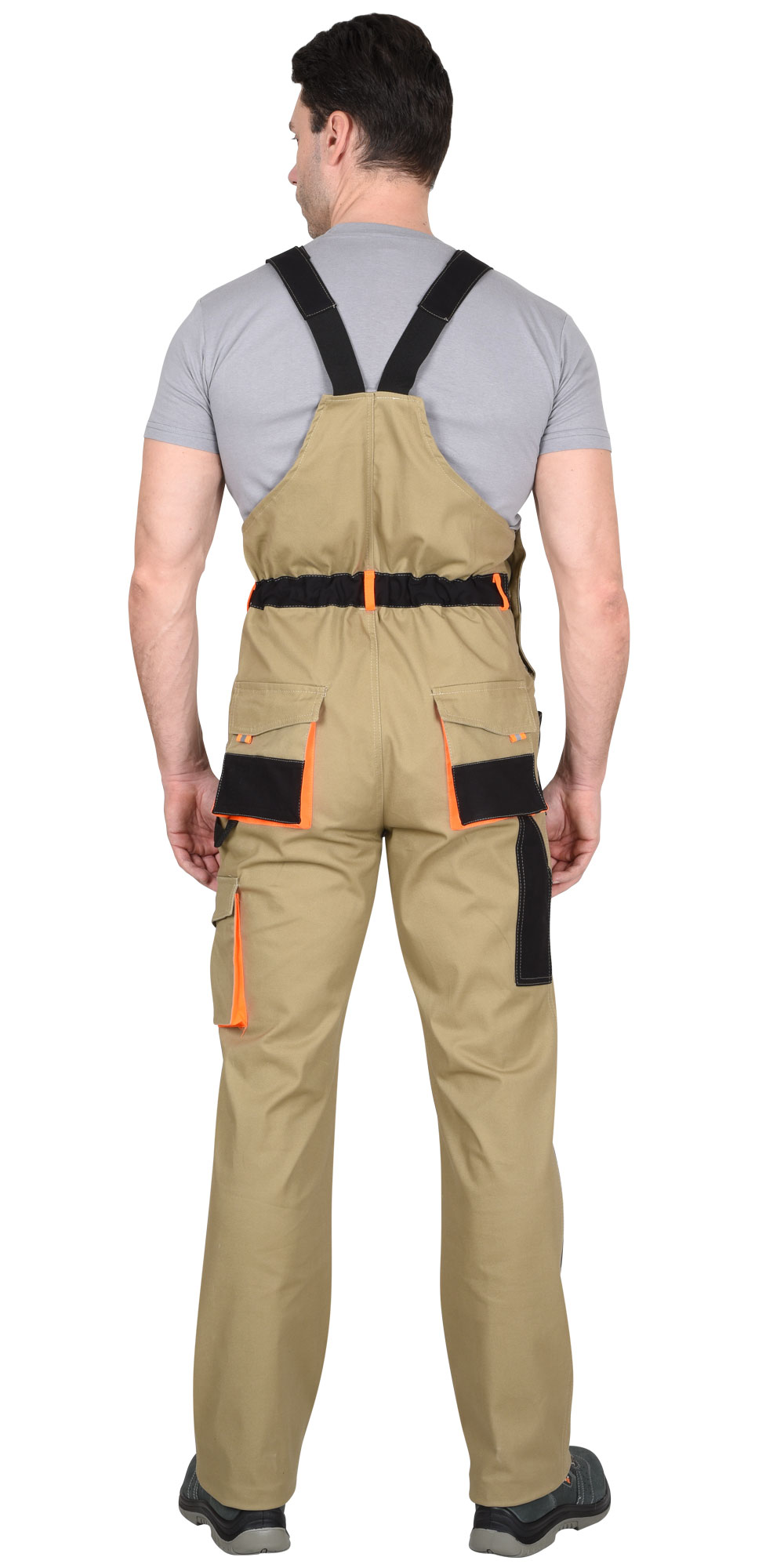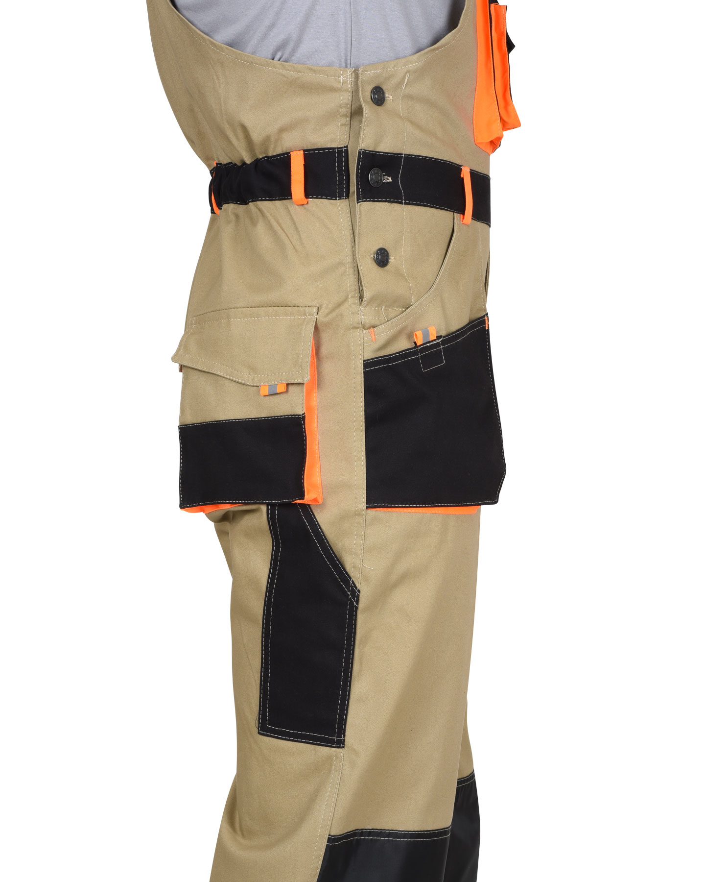 Полукомбинезон с застежкой гульфика на «молнию» и с застежкой в правом боковом шве на три петли и три пуговицы , с нагрудным накладным большим и малым карманом и карманом для телефона, с боковыми внутренними карманами, с накладным карманом на левом боковом шве с клапаном на липучке, с наколенниками, с двумя задними карманами с клапанами , и карманом для инструментов, по спинке вставлена резинка.