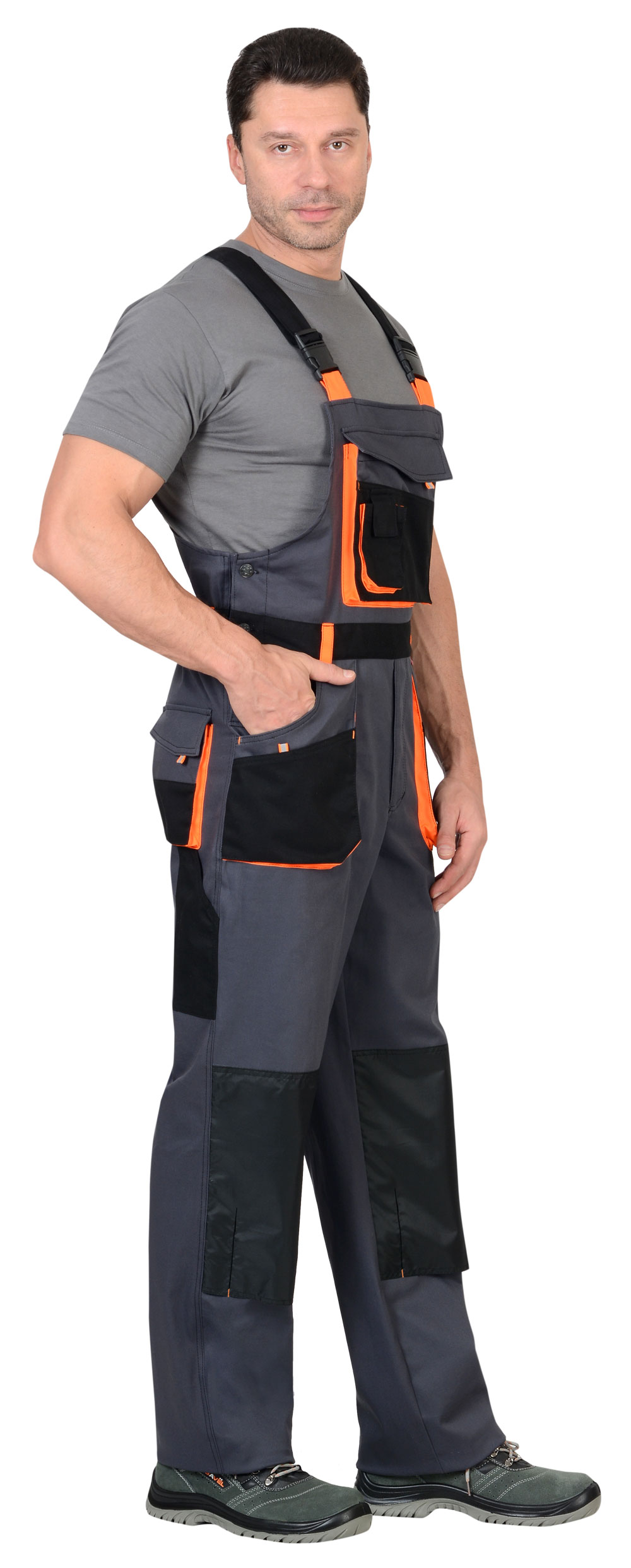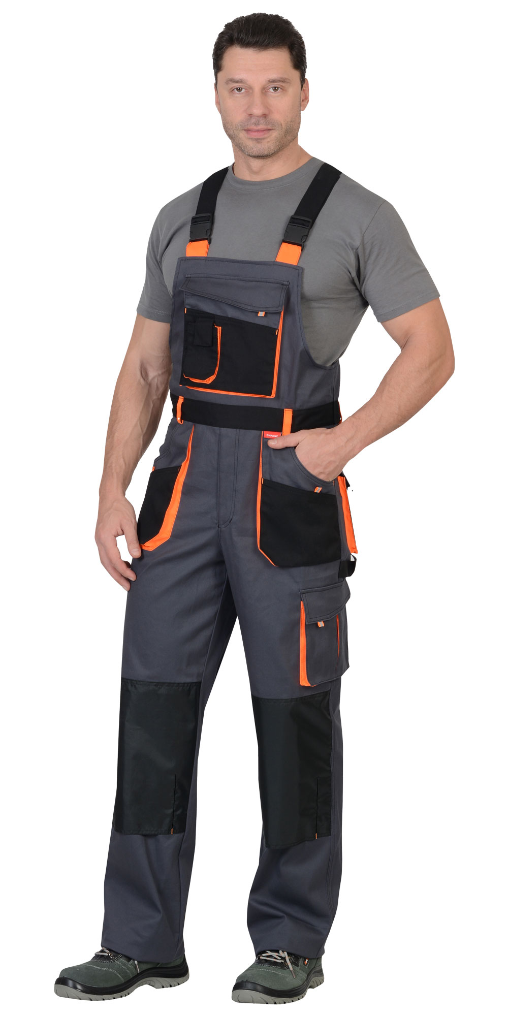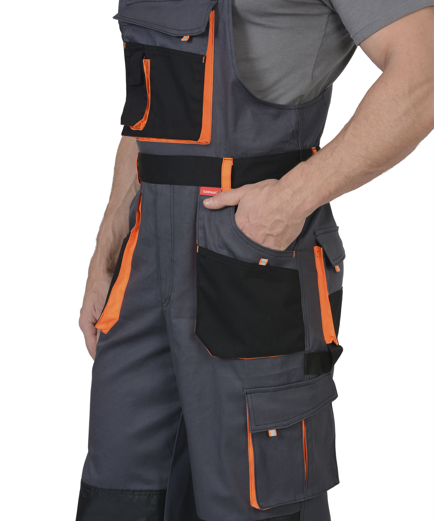 Полукомбинезон с застежкой гульфика на «молнию» и с застежкой в правом боковом шве на три петли и три пуговицы, с нагрудным накладным большим и малым карманом и карманом для телефона, с боковыми внутренними карманами, с накладным карманом на левом боковом шве с клапаном на липучке, с наколенниками, с двумя задними карманами с клапанами и карманом для инструментов, по спинке вставлена резинка.