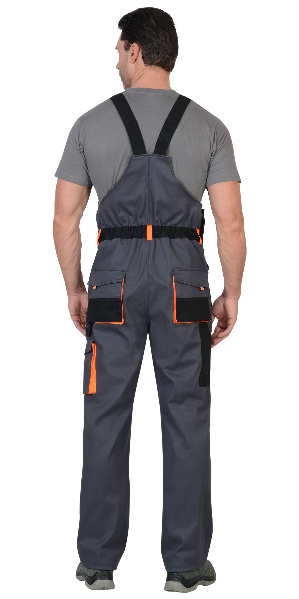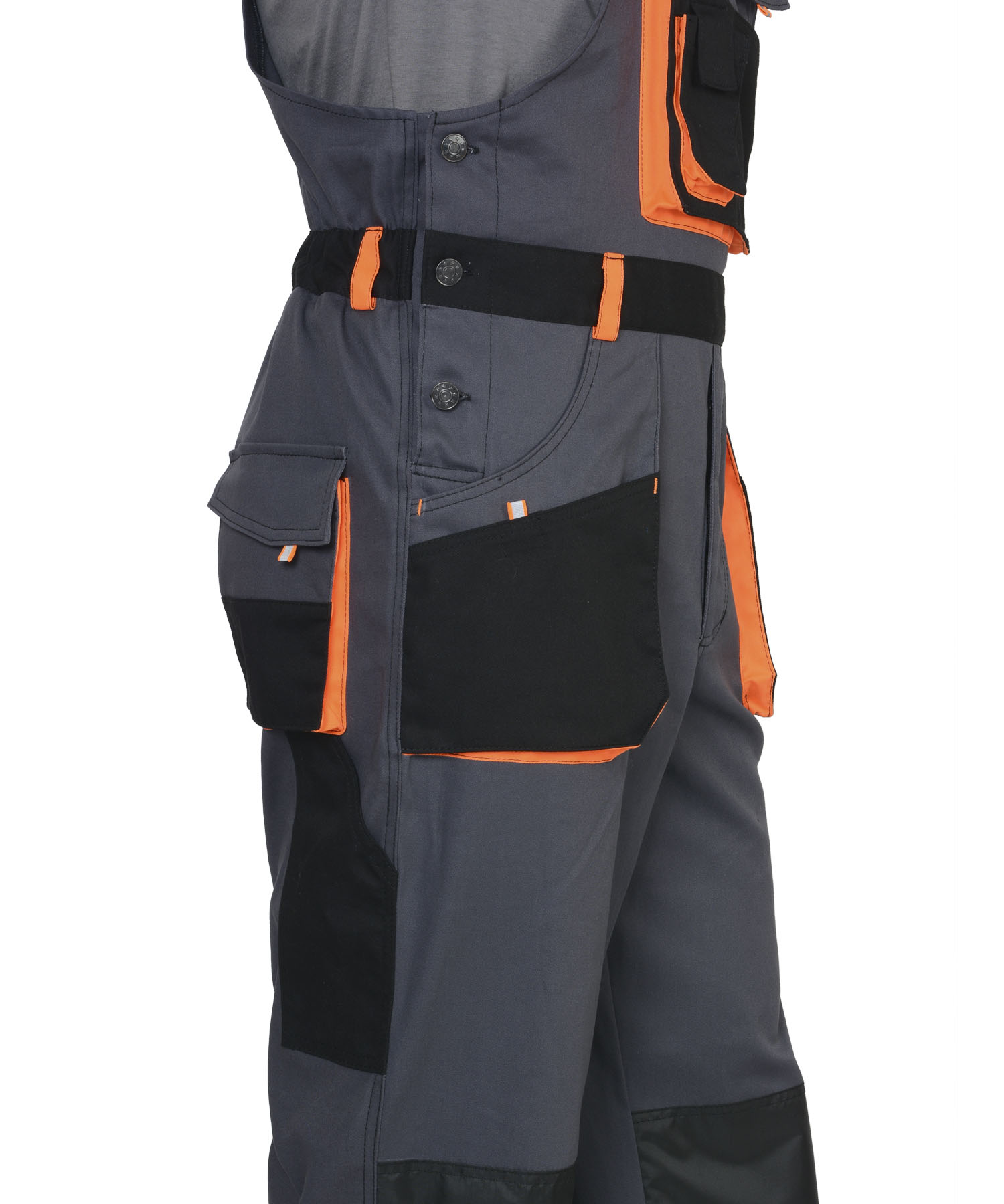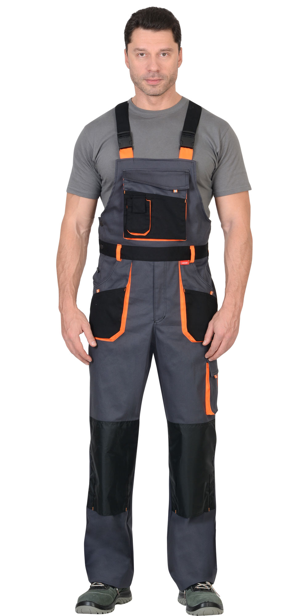 Полукомбинезон с застежкой гульфика на «молнию» и с застежкой в правом боковом шве на три петли и три пуговицы, с нагрудным накладным большим и малым карманом и карманом для телефона, с боковыми внутренними карманами, с накладным карманом на левом боковом шве с клапаном на липучке, с наколенниками, с двумя задними карманами с клапанами и карманом для инструментов, по спинке вставлена резинка.