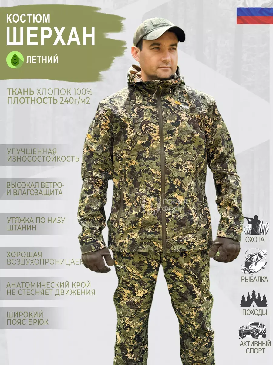 Костюм тактический летний Sherhan лес от бренда NOVATEX – идеальный выбор для мужчин, предпочитающих комфорт и стиль в повседневной жизни, туризме или желающих подарить что-то особенное. Идеальный выбор для любителей охоты, рыбалки. Эта военная камуфляжная форма мультикам изготовлена из 100% хлопка, что обеспечивает естественную влагопроницаемость и дышащесть ткани. Уникальный камуфляжный рисунок и оранжевый логотип добавляют костюму уникальность и стиль. Костюм оснащен молнией и липучкой для удобства надевания и снятия. Прорезные карманы на молнии и ростовка для высоких людей делают его практичным и комфортным в любых ситуациях. Благодаря ветрозащитным свойствам, костюм подходит для использования в температурном диапазоне от +15 °C до +25 °C. Прекрасно подойдет в качестве подарка другу, мужчине на День Рождения.